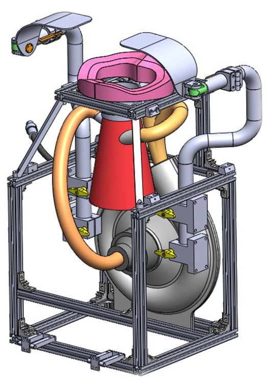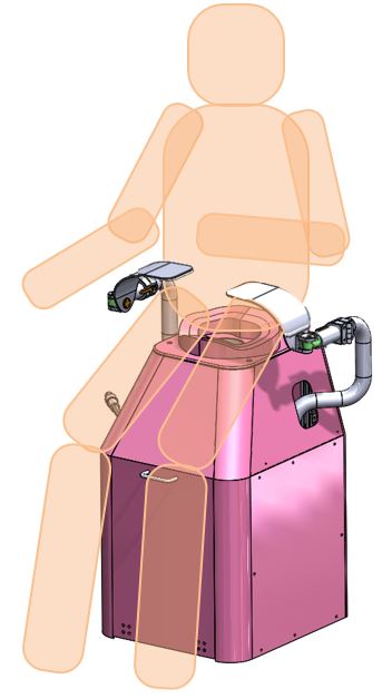 ハンドルを回転させることによってポンプから風を送り、風によって便が体から分離します。その気流に乗せて,外部ににおいなどを漏らすことなく排泄物を捕集します。